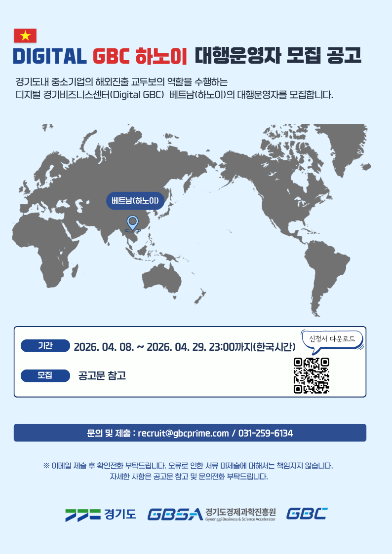 저희 경기도경제과학진흥원은 경기도 산하 공공기관으로서, 도내 중소기업의 해외 진출 지원을 위해 다양한 수출지원사업을 추진하고 있습니다. 특히 2005년 뭄바이를 시작으로 현재 전 세계 21개국 27개소에 경기비즈니스센터(GBC) 네트워크를 구축하여 운영 중이며, 이번에 2026년 베트남(하노이)에 신규 개소를 추진하고 있습니다.