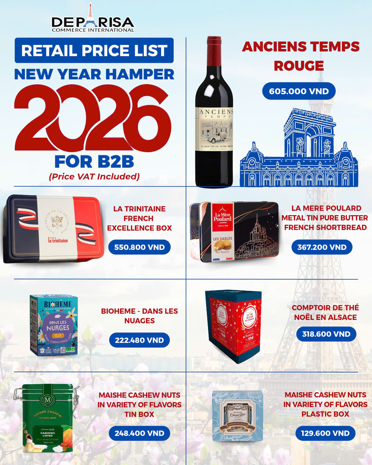 With 15 years of experience in international commercial activities, Deparisa Vietnam - the importer of local French fine brands of Biscuits (La Mère Poulard (Depuis 1888), La Trinitiane), Tea (Comptoir, Bioheme), and other local nuts (Maishe), with many selections of set, Deparisa would like to offer special B2B scheme for TET Gifting orders from KOCHAM members, as shown in the brochure.