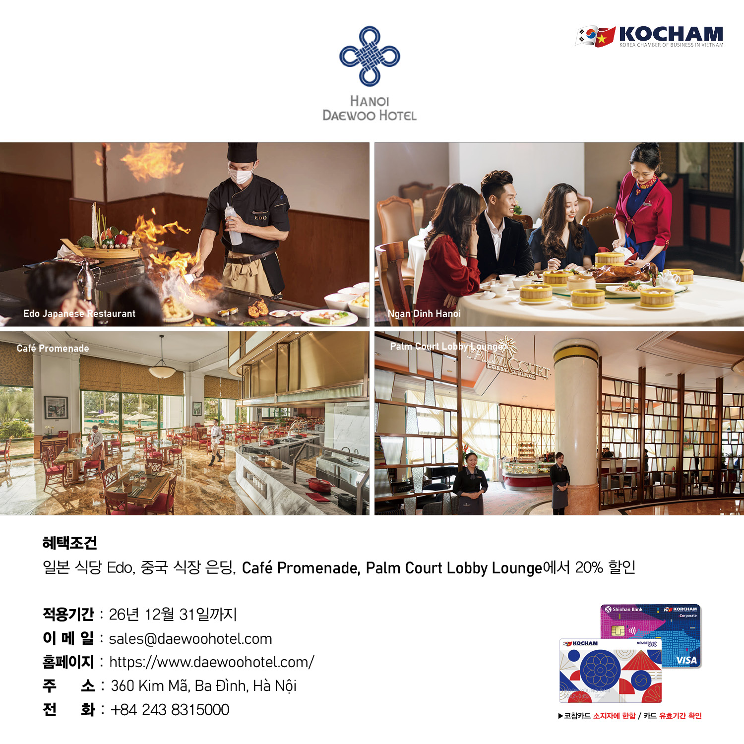 하노이대우호텔 F&B에서 코참 회원분들 위해 할인혜택을 제공합니다.