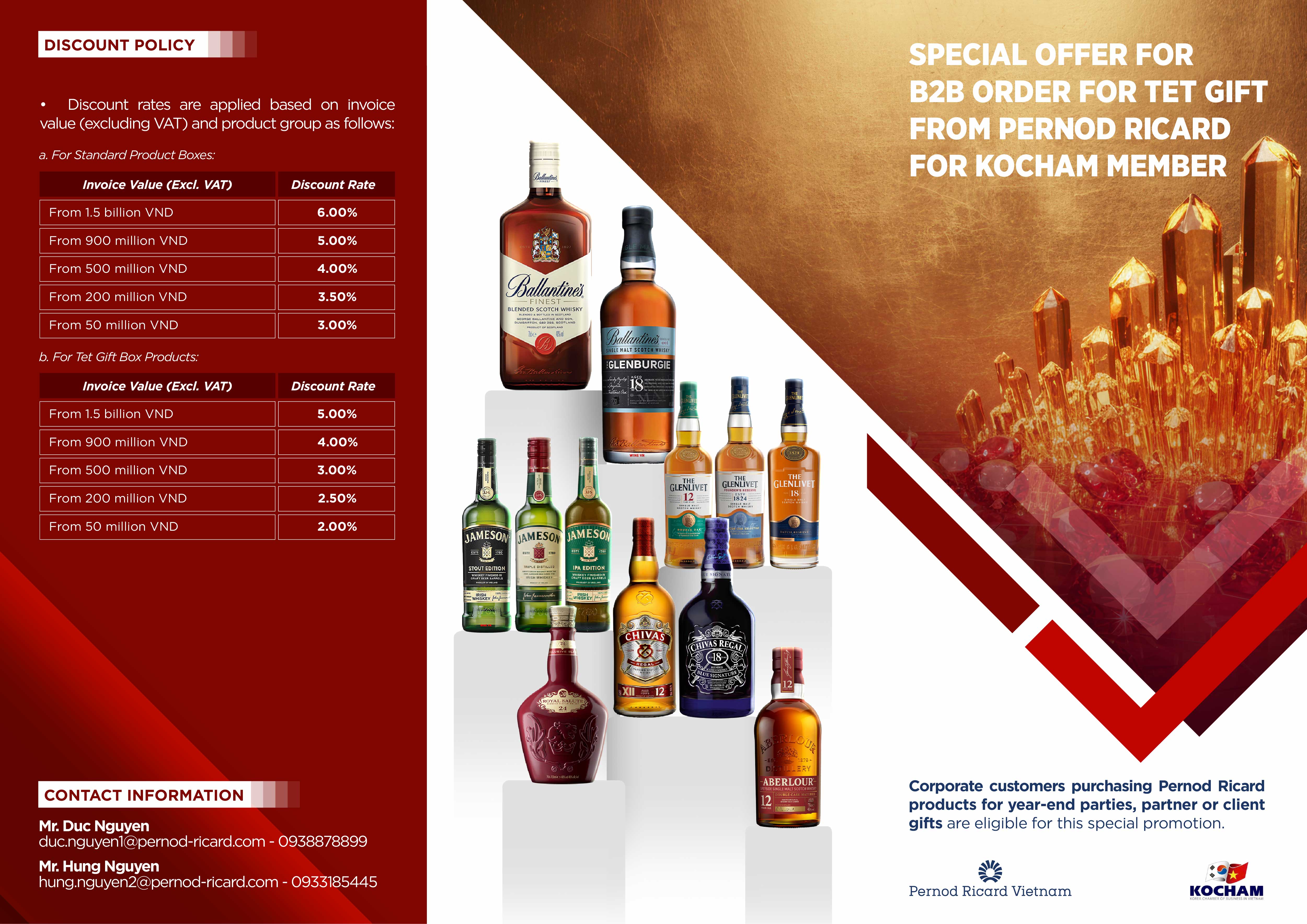 Pernod Ricard Vietnam - officialy global distributor of renown whiskies brands namely Ballantines, Chivas, The Glenlivet, Aberlour, Longmon... wishes to offer special discount program on B2B orders for Tet Giftings from Kocham members. Details as shown in the brochure.