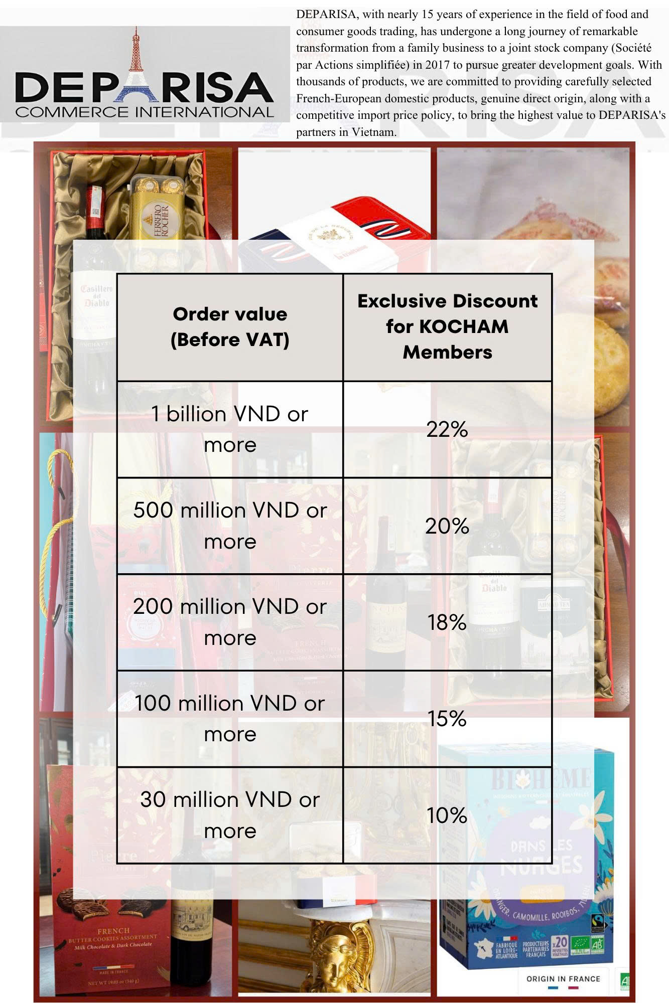 With 15 years of experience in international commercial activities, Deparisa Vietnam - the importer of local French fine brands of Biscuits (La Mère Poulard (Depuis 1888), La Trinitiane), Tea (Comptoir, Bioheme), and other local nuts (Maishe), with many selections of set, Deparisa would like to offer special B2B scheme for TET Gifting orders from KOCHAM members, as shown in the brochure.
